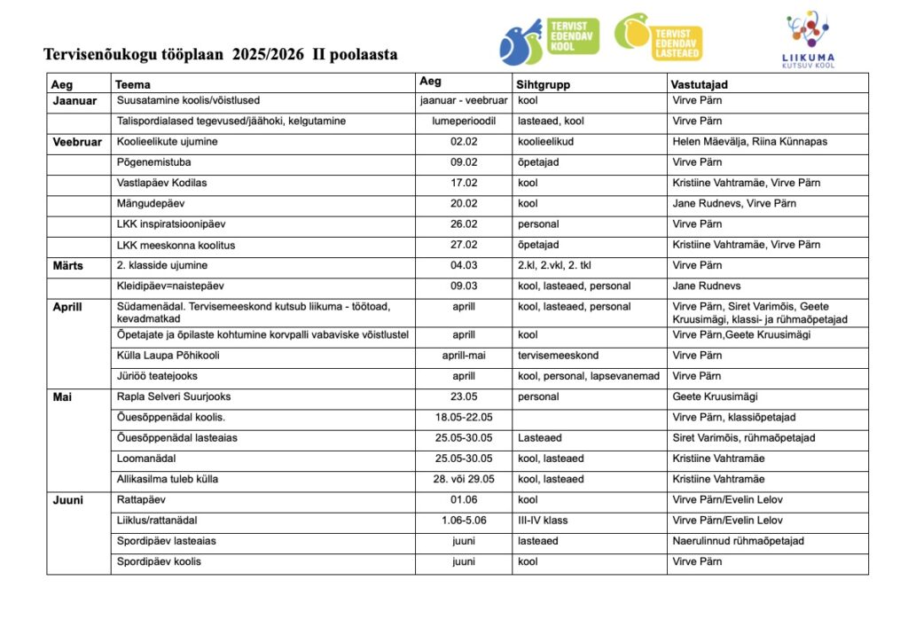 Alu Kooli tervise edendamisega tegeleb TERVISEMEESKOND Tervisemeeskonda kuuluvad: Virve Pärn Siret Varimõis Kristiine Vahtramäe Geete Kruusimägi Karin Radiko Kette-Liisa Ojamaa Kati Domberg Jane Rudnevs